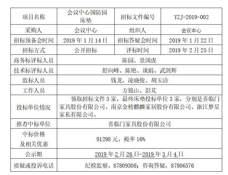 備注:投標人對招標結(jié)果有疑問的,應(yīng)采用書面形式,寫清質(zhì)疑內(nèi)容、具體事實和理由并附相關(guān)證據(jù)材料,由法定代表人簽字并加蓋單位公章后在公示期內(nèi)送達指定部門。 揚子江集團集中采購辦 2019年2月26日 |