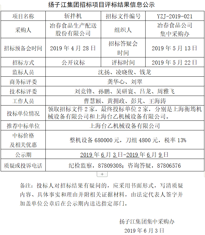 揚(yáng)子江集團(tuán)招標(biāo)項(xiàng)目評標(biāo)結(jié)果信息公示