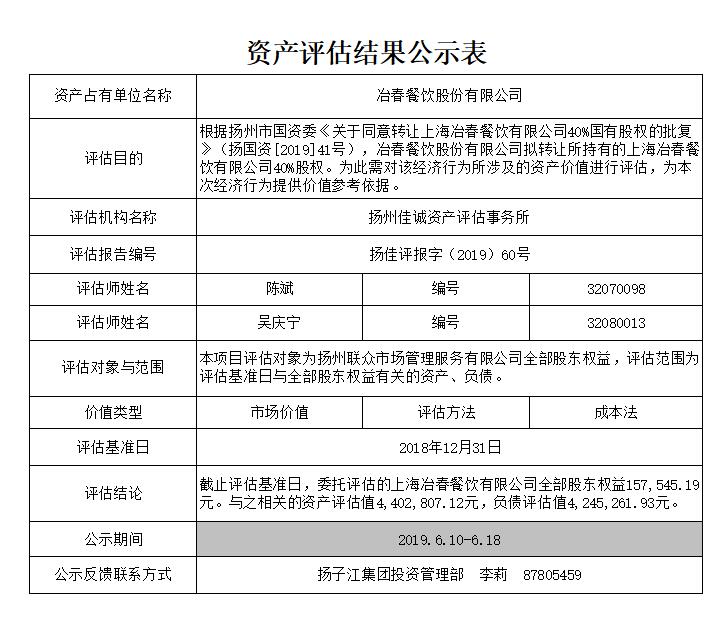 根據(jù)揚(yáng)州市國(guó)資委《關(guān)于同意轉(zhuǎn)讓上海冶春餐飲有限公司40%國(guó)有股權(quán)的批復(fù)》(揚(yáng)國(guó)資[2019]41號(hào)),冶春餐飲股份有限公司擬轉(zhuǎn)讓所持有的上海冶春餐飲有限公司40%股權(quán),現(xiàn)公告如下: 一、經(jīng)過(guò)甄選比價(jià),冶春餐飲股份有限公司選聘揚(yáng)州佳誠(chéng)資產(chǎn)評(píng)估事務(wù)所承擔(dān)本次股權(quán)轉(zhuǎn)讓的評(píng)估工作,評(píng)估基準(zhǔn)日為2018年12月31日(相關(guān)評(píng)估內(nèi)容見(jiàn)《資產(chǎn)評(píng)估結(jié)果公示表》)。 二、自公告之日起7個(gè)工作日內(nèi)接受咨詢,咨詢電話:87805459,聯(lián)系人:李莉。