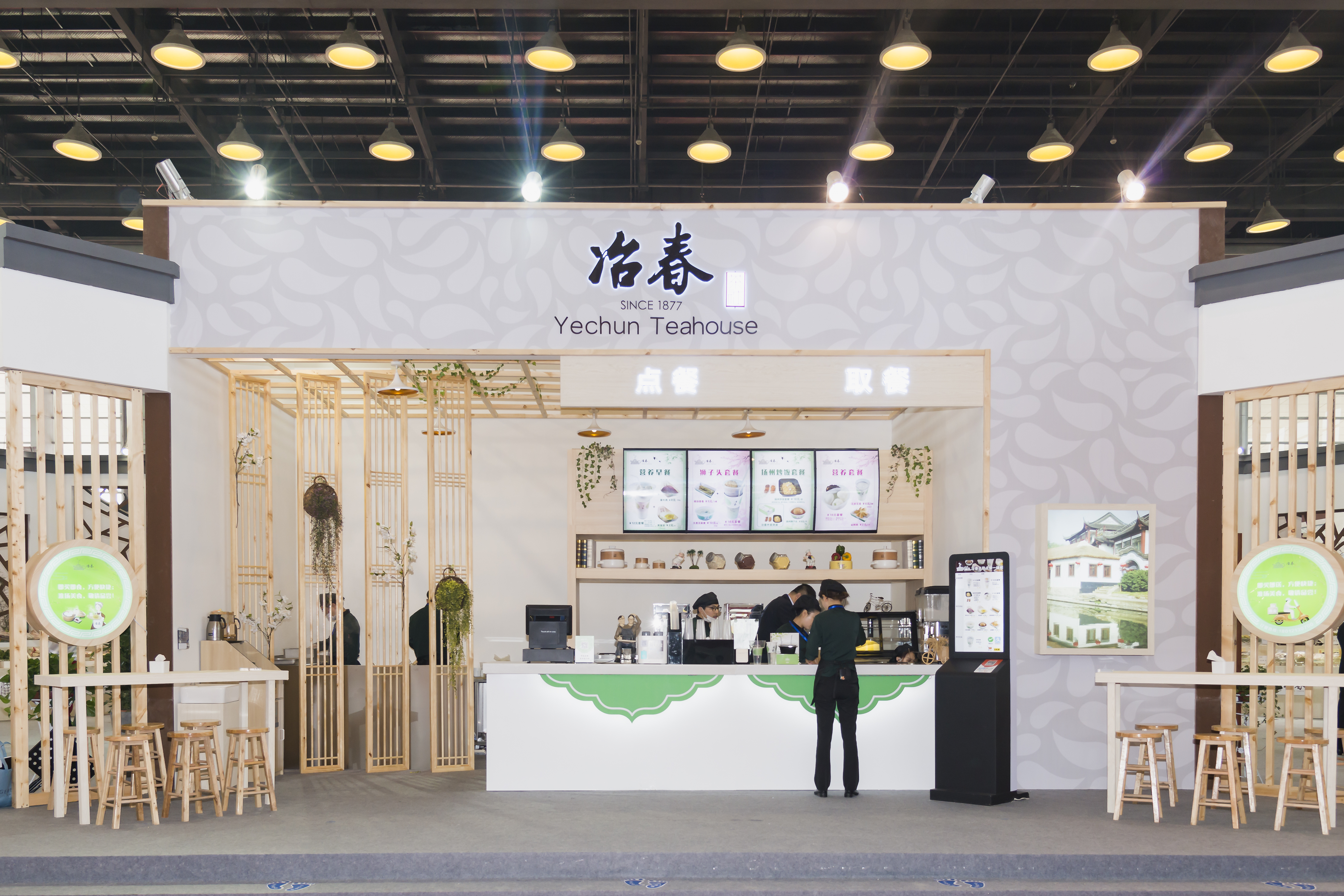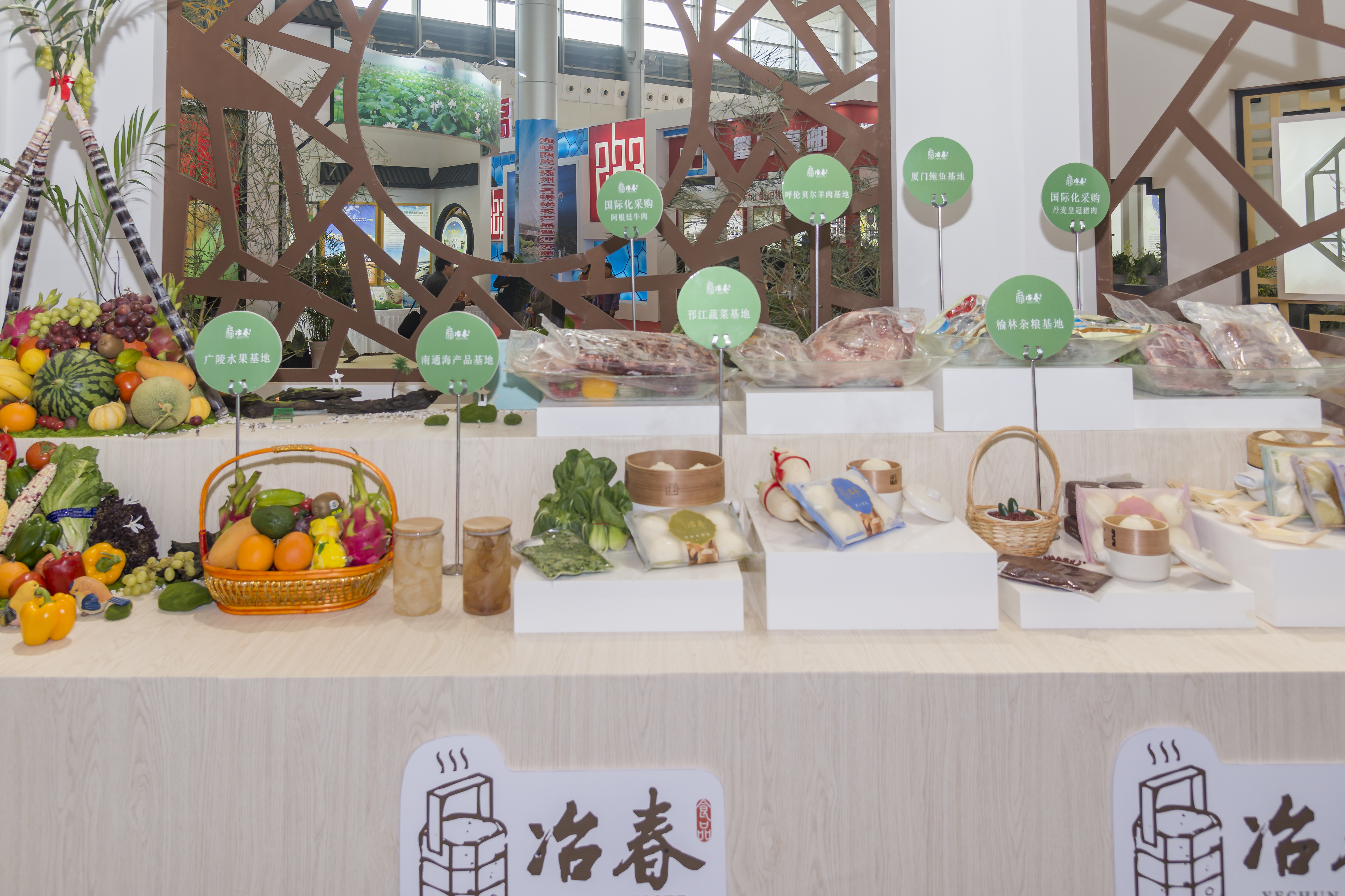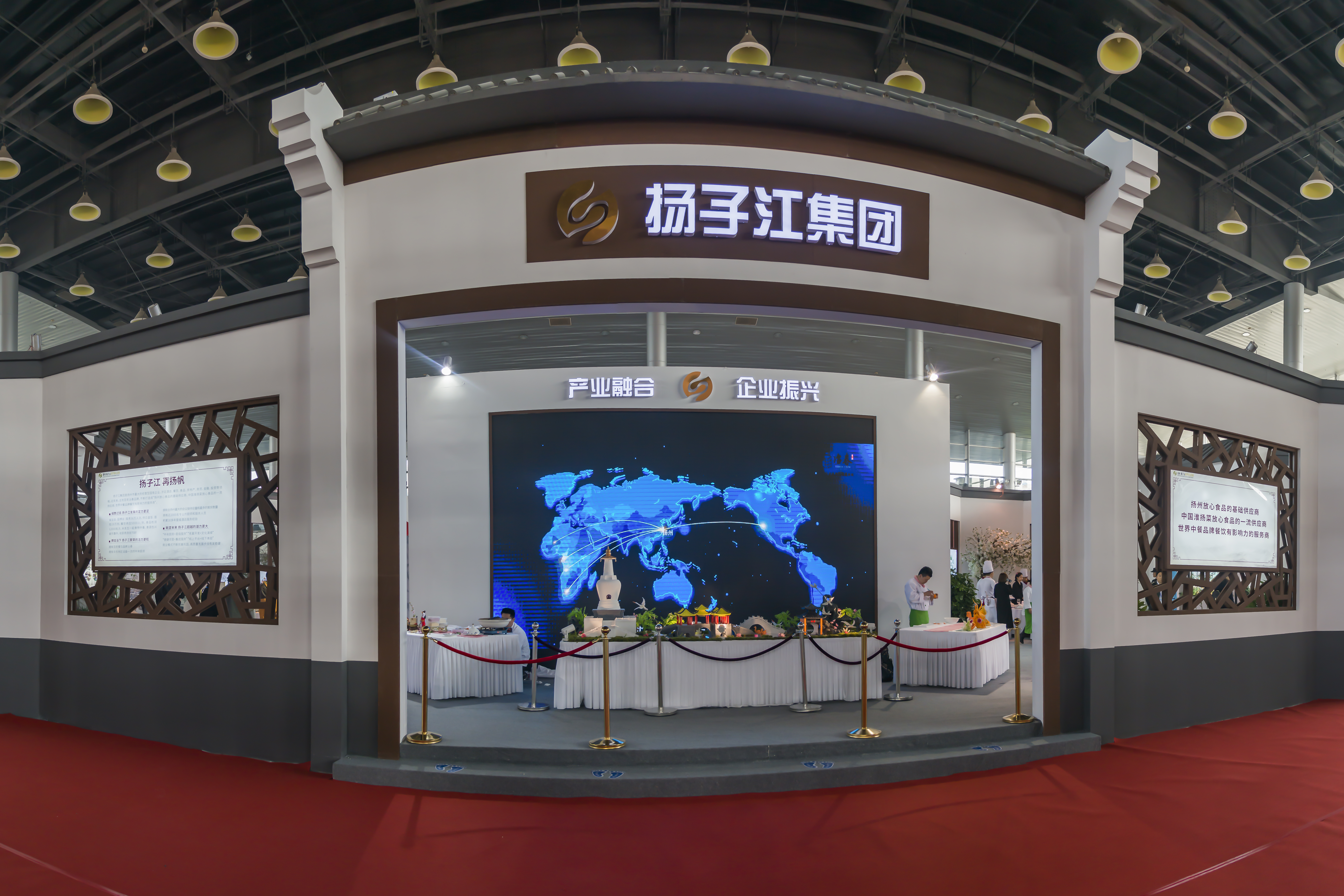 揚(yáng)子江集團(tuán)展位共包括冶春快捷店、冶春食品展示區(qū)、名宴婚宴及互動表演三產(chǎn)融合四大內(nèi)容,用雕花隔窗、博古架進(jìn)行區(qū)隔。一產(chǎn)是基地食材產(chǎn)品,包括江蘇省內(nèi)、全國范圍和國際化合作采購食材。二產(chǎn)是中央廚房產(chǎn)品,包括集體配餐、大廚好幫手、居家便捷才等系列以及面點(diǎn)、豆?jié){、經(jīng)典淮揚(yáng)菜、料包、禮盒等產(chǎn)品。三產(chǎn)為冶春快捷店和高端名宴。名宴為煙花三月宴和新三頭宴,煙花三月宴高度契合揚(yáng)州4·18煙花三月國際經(jīng)貿(mào)旅游節(jié)主題;新三頭宴中嵌入了文明有禮24條中的文明用餐四個(gè)規(guī)矩,倡導(dǎo)文明用餐;同時(shí),還通過揚(yáng)州經(jīng)典景點(diǎn)雕刻、果蔬雕刻、面點(diǎn)制作、揚(yáng)州炒飯制作等,展示揚(yáng)子江集團(tuán)淮揚(yáng)菜精湛的工藝。