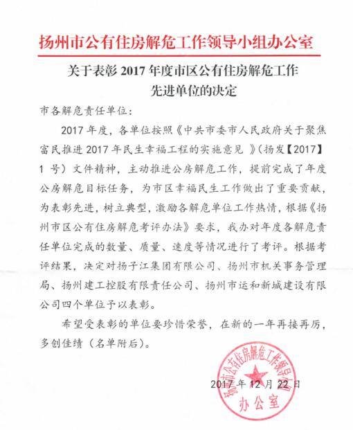 近日,市共有住房解危工作領導小組辦公室發(fā)來2017年度公房解危工作表彰單位名單,揚子江集團榮獲一等獎。 2017年市委、市政府1號文件要求集團完成1000㎡公房解危工作。在政府相關部門的支持和指導下,集團8月份已提前超額完成1475.6㎡解危任務,45家住戶解決危房困難,其中包括異地安置解危5戶、面積178.20㎡,修繕公有住房40戶、面積1297.4㎡。下一階段,將加大對遺留問題的處理力度,同時繼續(xù)做好2018年的解危工作,力爭全面落實完成好市委、市政府交辦的工作任務。(集團辦公室)